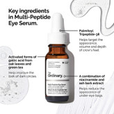 سرم مخصوص دور چشم مولتی پپتید برند Ordinary دارای خواص ضد پیری، سفت کننده، ضد سیاهی دور چشم، طراوت بخش، صاف کننده و ... می باشد. با استفاده از این سرم نواحی متورم، سیاهی و حلقه های تیره زیر چشم، خطوط ریز و چروک ها به طور قابل توجهی به حداقل می رسد. بافت آن نسبتا سبک بوده و به سرعت جذب می شود. استفاده از آن نیز به دلیل طراحی بطری و قطره چکان آسان است. این سرم نتایجی عالی را در مدت کوتاهی ایجاد می کند. از طرفی دیگر کمک می کند تا پوست همیشه خیلی صاف و نرم به نظر برسد. این محصول باعث تحریک چشم های حساس هم نمی شود.